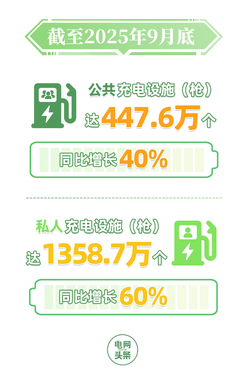 近日,国家能源局发布9月全国电动汽车充电设施数据。根据国家充电设施监测服务平台数据,截至2025年9月底,我国电动汽车充电基础设施(枪)总数达到1806.3万个,同比增长54.5%。其中,公共充电设施(枪)447.6万个,同比增长40%,公共充电桩额定总功率达到1.99亿千瓦,平均功率约为44.36千瓦;私人充电设施(枪)1358.7万个,同比增长60%,私人充电设施报装用电容量达到1.20亿千伏安。